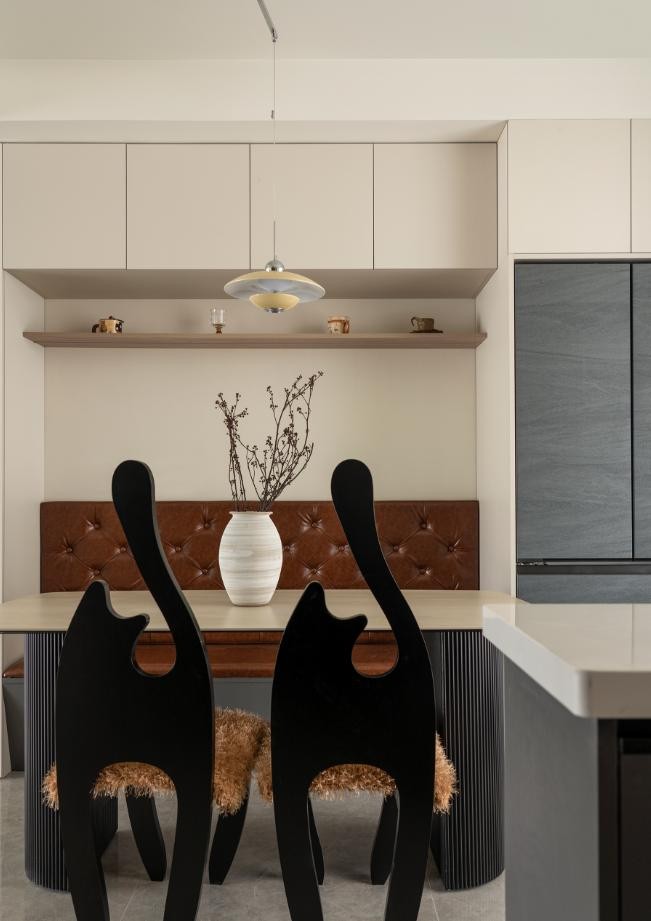 皮质拉扣的卡座、冻石岩板餐桌,搭配摇臂式灯具,每一处细节都透露着生活品质。让空间在现代与复古之间游走,充满了艺术气息。