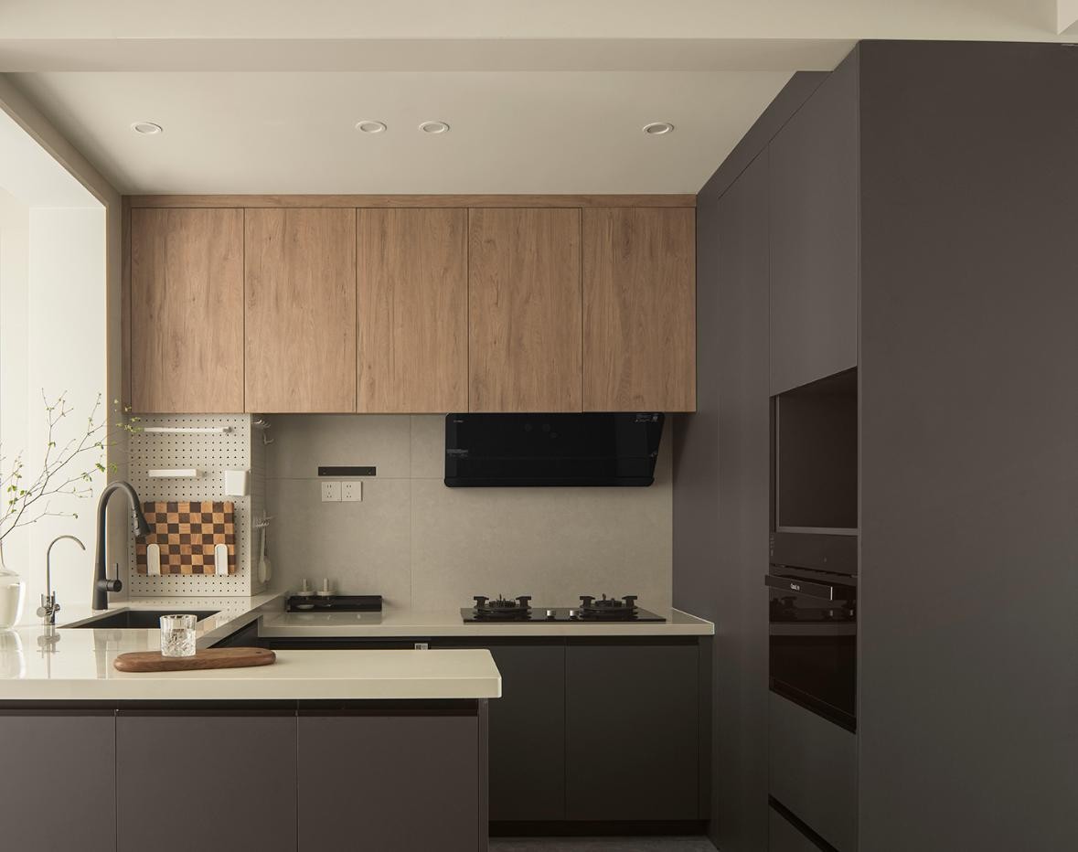 餐厨部分根据屋主需求,我们大胆拆除隔墙,打造出半开放式的厨房与用餐空间。
