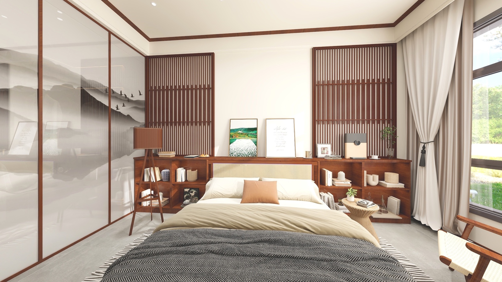 墙、顶、装修线条柜体床体定制,满足色调统一。隔栅营造氛围,多功能床头满足储物和书架的功能,开放衣帽间外加艺术山水玻璃推拉门提示质感