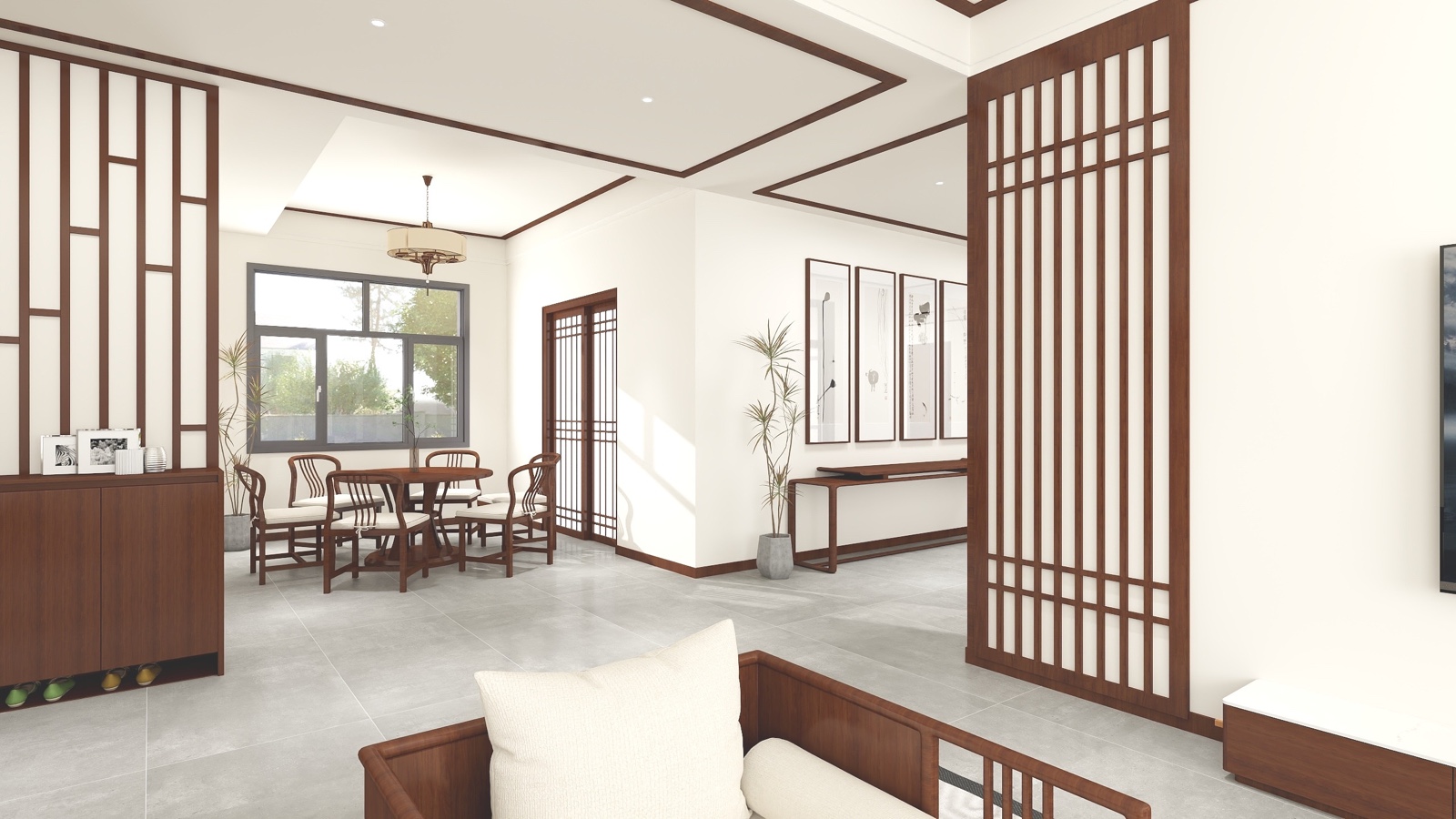 客厅和餐厅中间用平吊顶和木线条做区分。装修线条和软装满足设计理念
