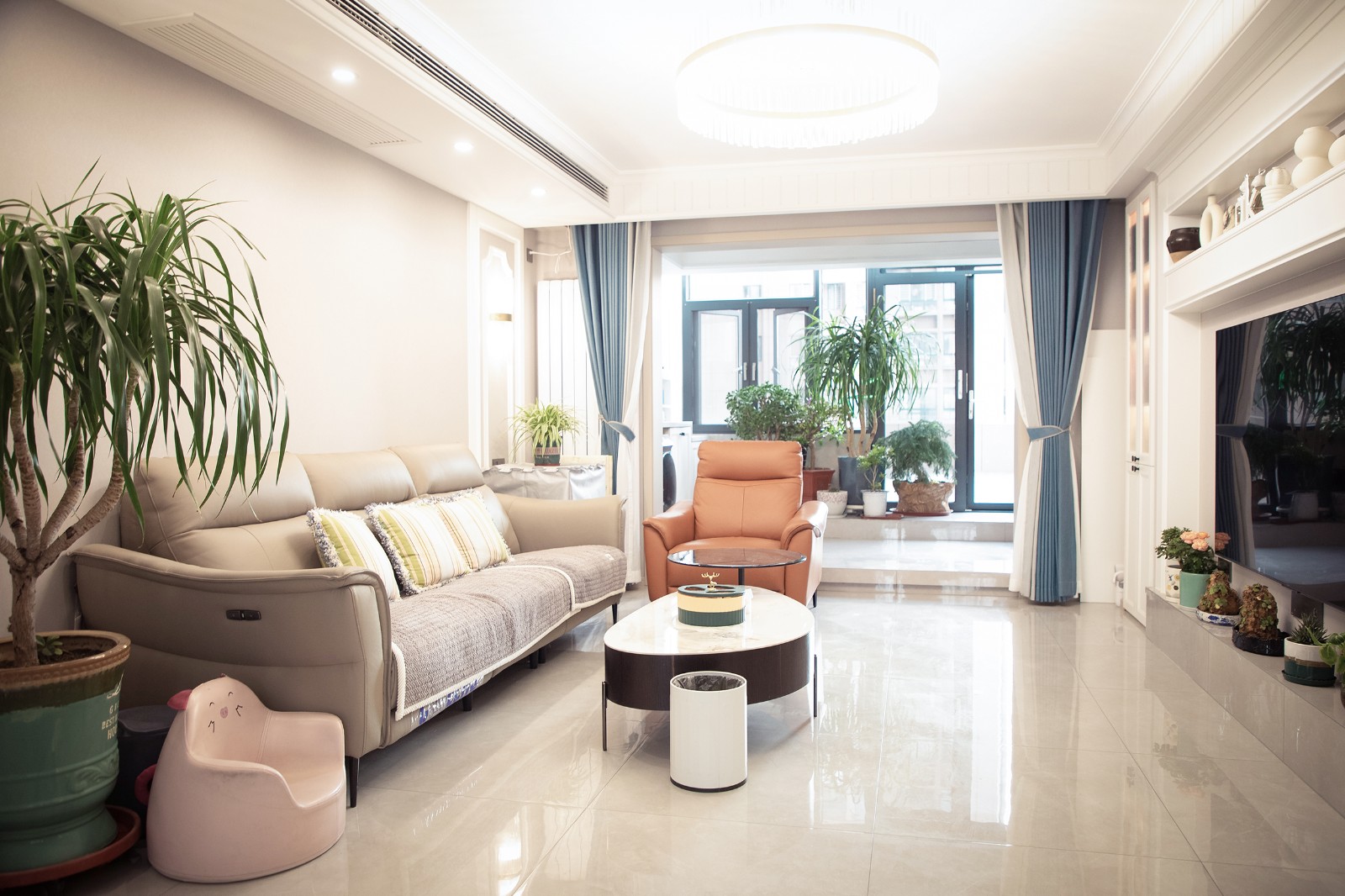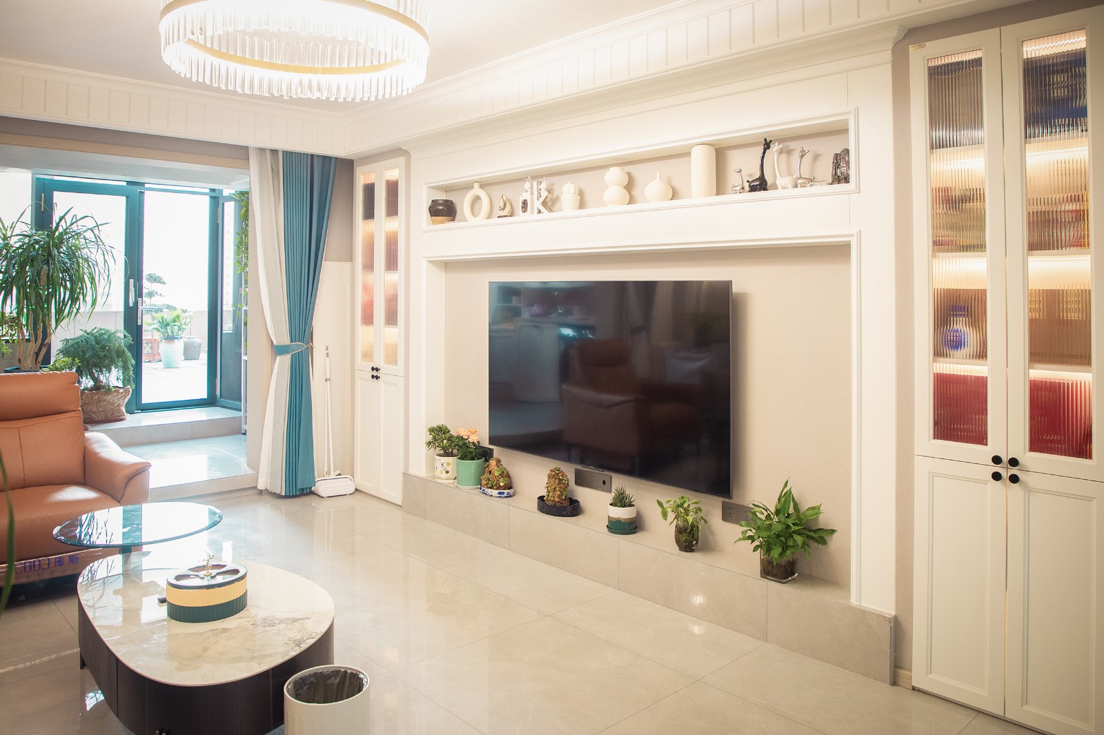 电视背景墙,原始结构的一侧有承重墙凸出,我们将相对一侧同样加厚拉平,中间形成一个框洞,使用PU线条进行装饰结合拱形角,扣上我们定制雕刻的一对石膏花角线(花角一个500大洋,电脑雕刻,只此一对),让墙面更加丰富与生动。