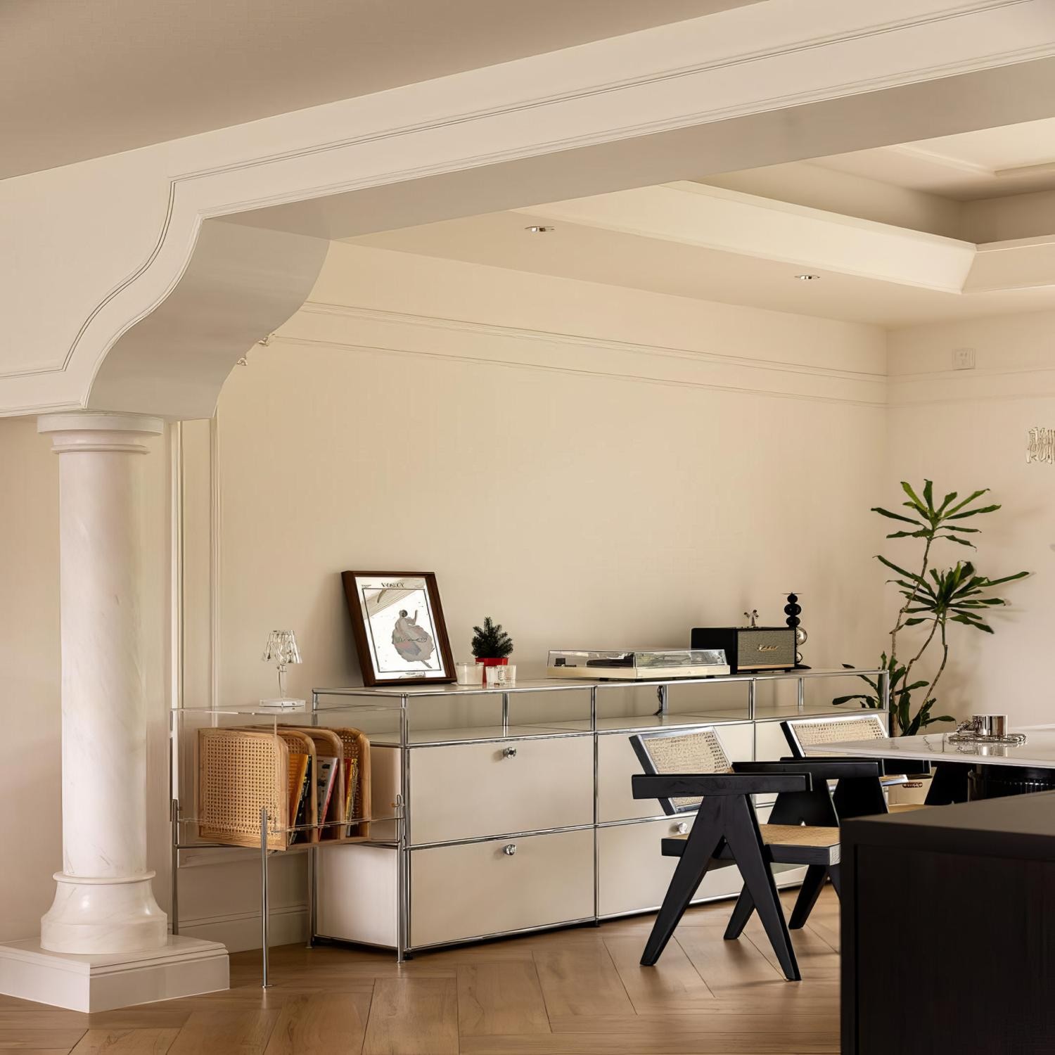 客厅改造中保留原吊顶、但是还是需要从新打磨刷漆的,这样看起来更统一和谐。地面换成了原木色木纹砖整个空间立马变温柔了。木纹砖考虑方便打理卫生,木色和轻法式搭配起来更舒适。