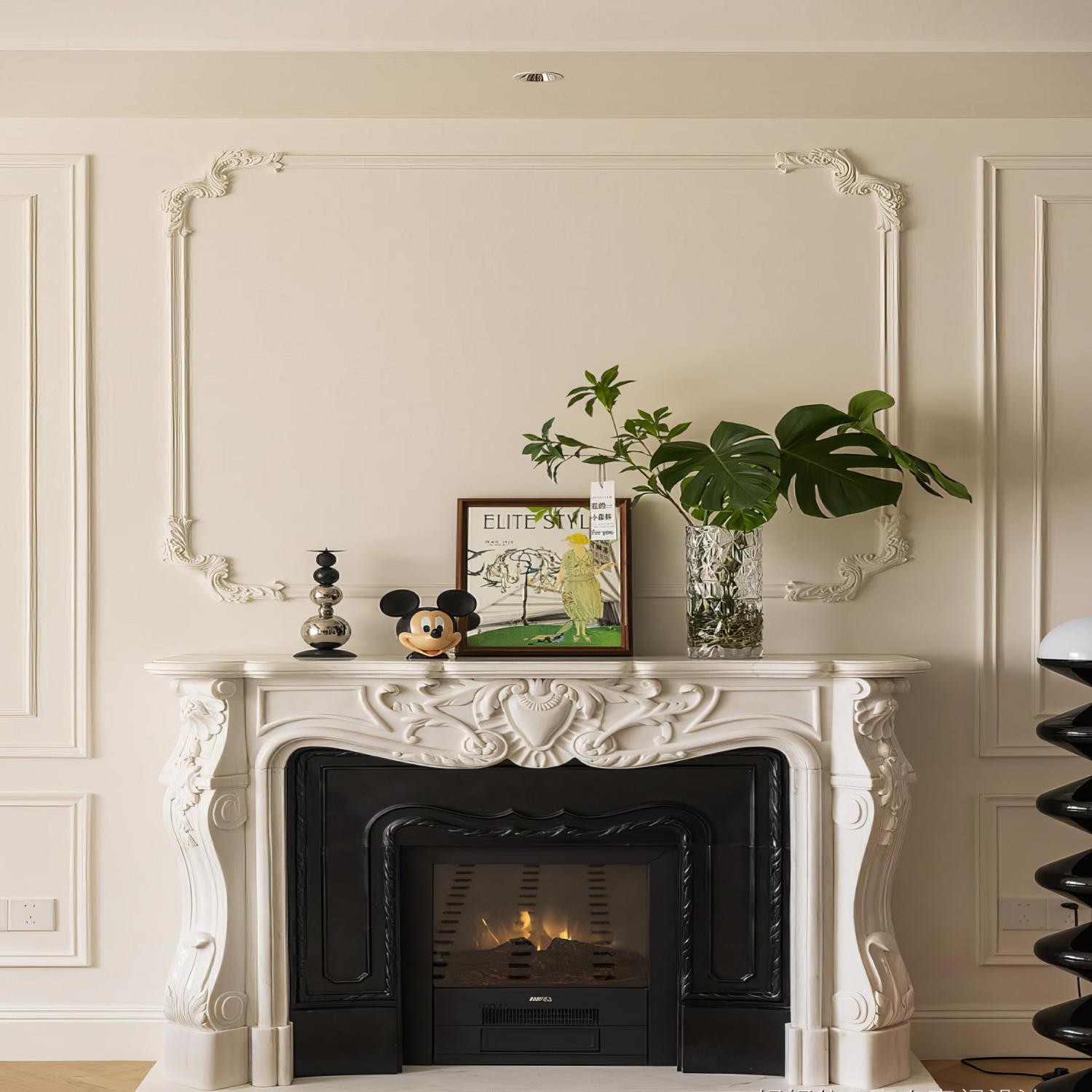 壁炉中间部分为黑色和白色背景形成鲜明对比,节日氛围很足的大理石壁炉,冬日里一家子在这里取暖,其乐融融。