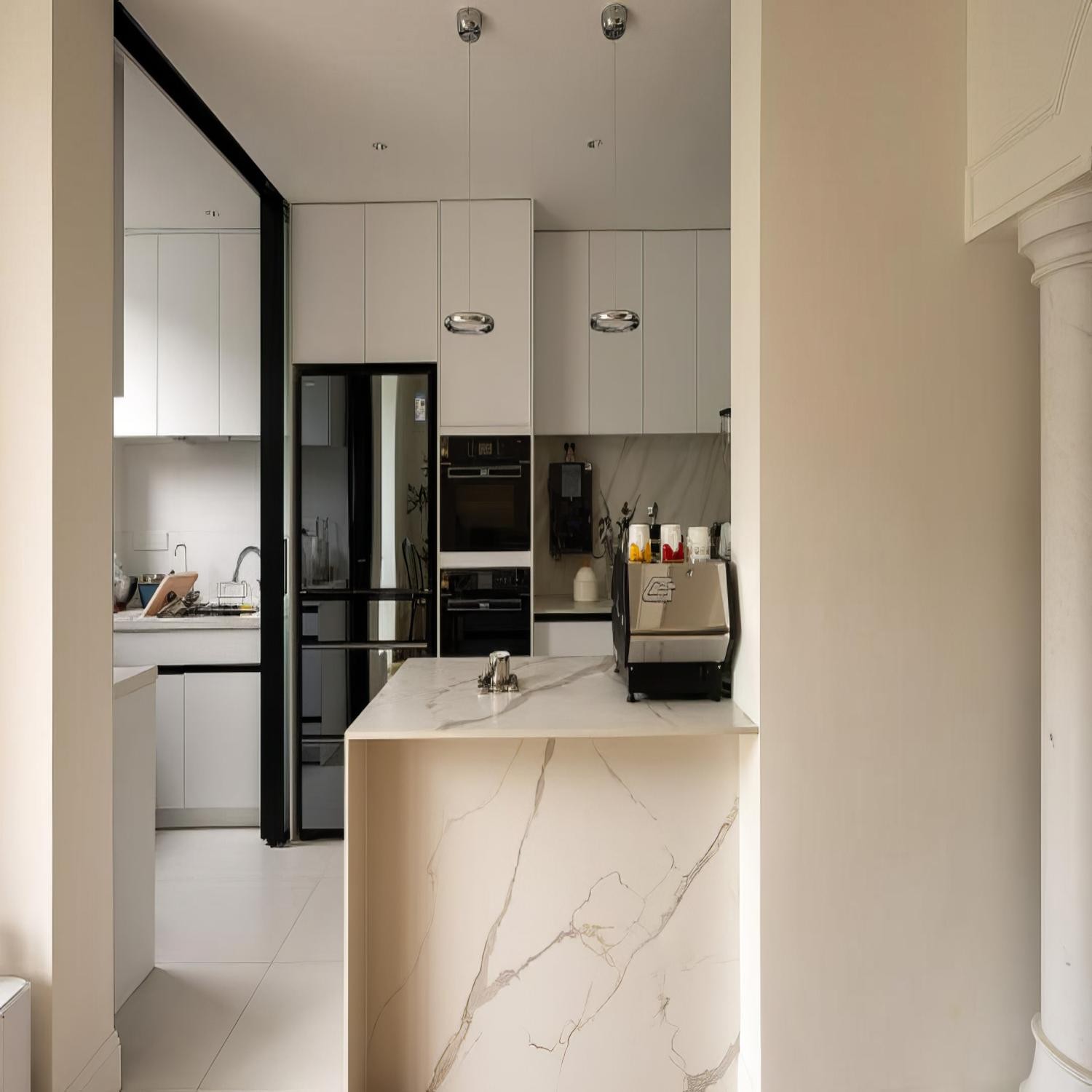 西橱简约的白黑配色,干净好打理;女业主比较喜欢手冲咖啡,中厨吧台处放咖啡机器方便操作。冰箱和烤箱做组合柜子,西厨台面装直饮水管线机方便即开即热很方便。