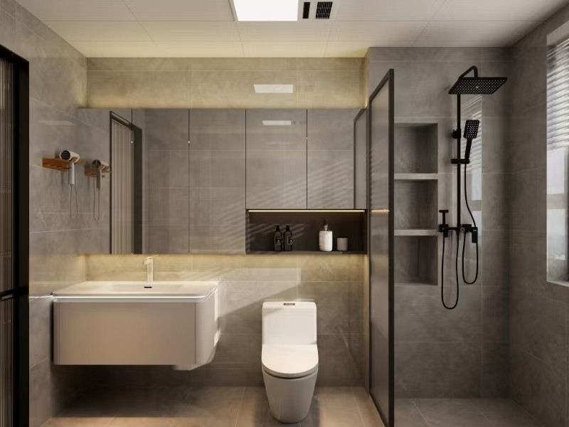利用玻璃隔断实现干湿分离,通长浴室柜增加空间延伸感