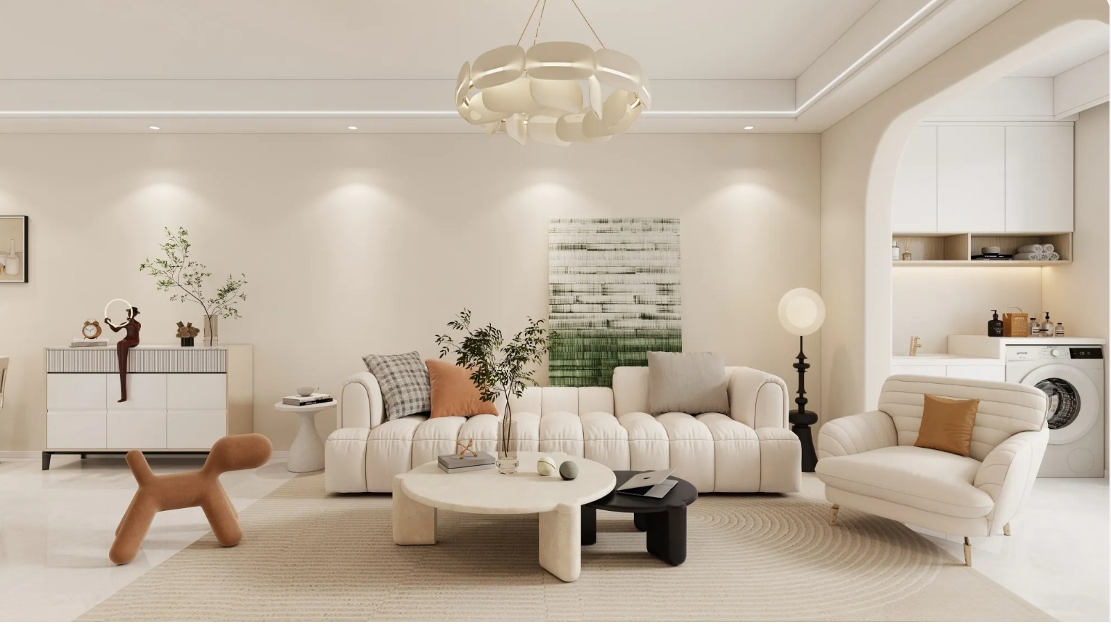 大面积的奶油色调为室内奠定了温馨氛围,在不复杂的布局与绿植装饰里,也流露出对平凡幸福生活的最真切向往。客厅中墙面留白,加以装饰画点缀,通过光线变化让空间有了温度;电视墙搭配悬空柜,既增加室内收纳,视觉上也变得更具空间感。