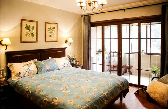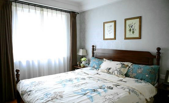 主卧是父母房,空间较大,设计必须依据父母的年龄、性格、志趣爱好,考虑宁静稳重的基调,创造一个完全属于他们的温馨环境。因而,在设计时所有的移门、柜门都按照他们的喜好选择了深色款式。双人床选择了美式非常经典的一款。起初还担心款式过于简单、老成,然而配上床品后,效果却出人意料的满意。房间还放置了一张休闲椅,藤制的较为轻便,父母可以轻松搬到阳台上小憩。