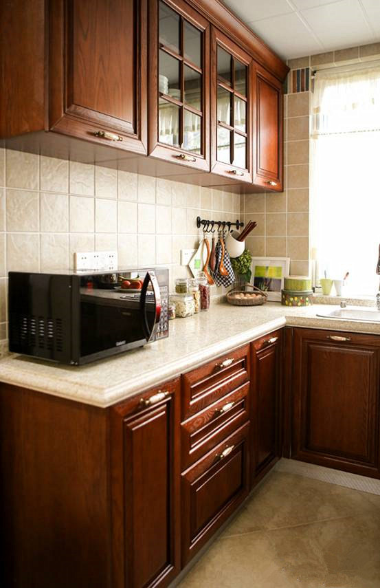 原本计划是选择白色的橱柜,来提升空间感。但考虑到妈妈的传统烹饪法,油烟较多,担心白色柜门经不起“熏烤”,因而还是选择了咖色系的红橡柜门配上弧形的台面。有了好的艺术环境,想必出来的作品会更令人惊叹~