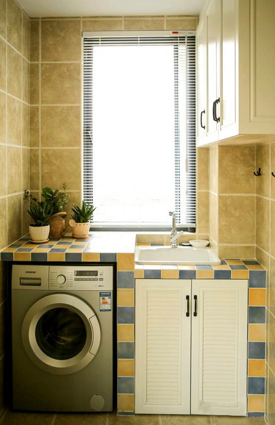 阳台:淡淡的绿色墙地砖,柔柔的绿色窗纱,白色地柜,砖砌的洗衣池搭配纯白色百叶窗,很沉静、典雅。