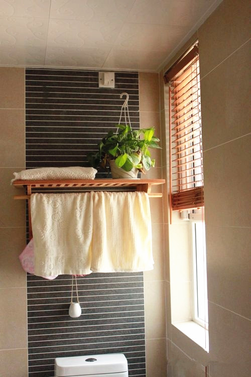 卫生间的墙砖仿古的纹理,马桶后面用了同款黑色的。
