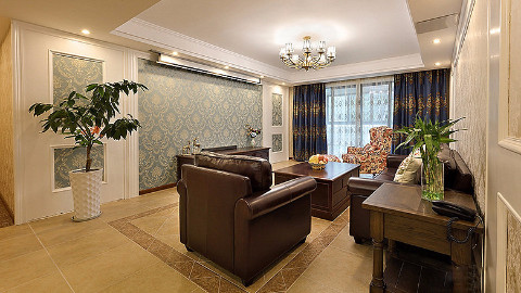 电视柜和茶几是配套的哦,也都是采用了实木美式风格,色彩和沙发相近