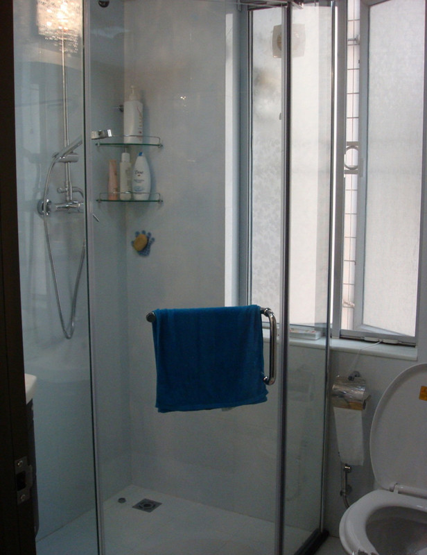主卫钻石型的淋浴室,把手可以挂毛巾,墙角装的是在网上淘的置物架。