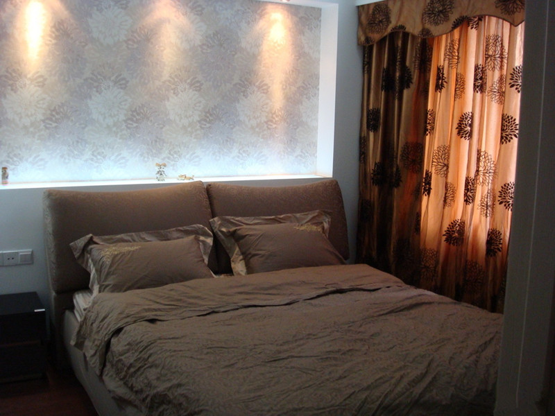 浅棕色不规则暗花的墙纸和深棕色的暗花窗帘,为卧室营造了那么一种温馨浪漫的感觉。