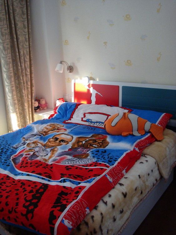 儿子的篮球睡床,1.5的,底下有抽屉,床头的扣篮运动员和他房间更衣室的科比门遥相呼应,呵呵!