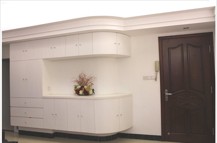 客厅靠门的墙壁增加了白色调的鞋柜,可以为家人提供大量的存储空间。除了存放鞋子,3个大抽屉还可以存放各种物品,这样就不必把零碎物品都摆在桌面上,让空间显得繁乱了。