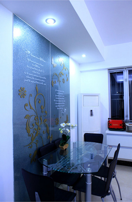 大气的墙贴玻璃餐厅背景和线条硬朗的白色备餐台,让平凡的区域也能成为视觉焦点。