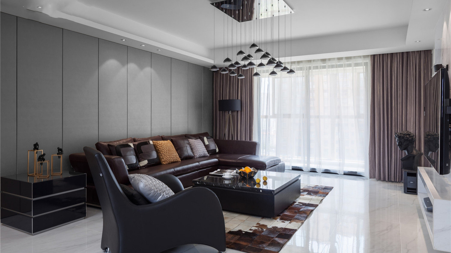 客厅电视背景墙有卧室门,做成隐形门使客厅更为整体,户型本身四个房间改为三房,主卧功能配置加以完备,主卧飘窗拆除与主卧连成一体