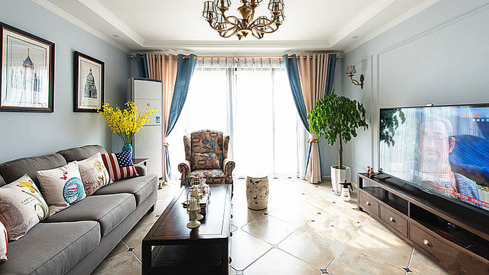 窗帘选择的是棉麻雪尼尔材质的,客厅用的是蓝色跟米色的拼色,免除了纯色的无趣。