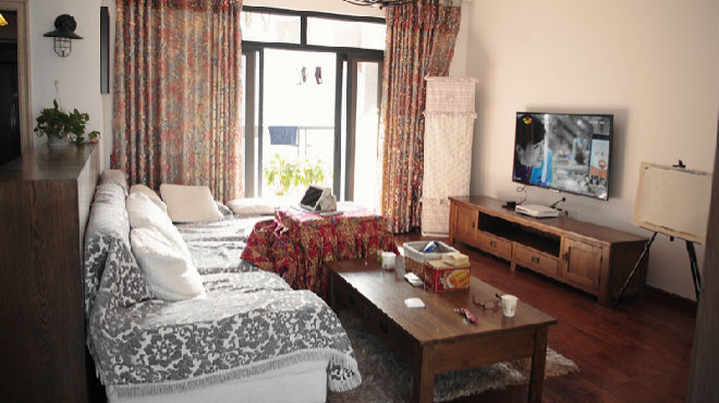 客厅主打中式风格~茶几和电视柜是自己设计的哦!为了不让客厅风格过于单调,所以提议选了一款花式窗帘,增加客厅色彩!