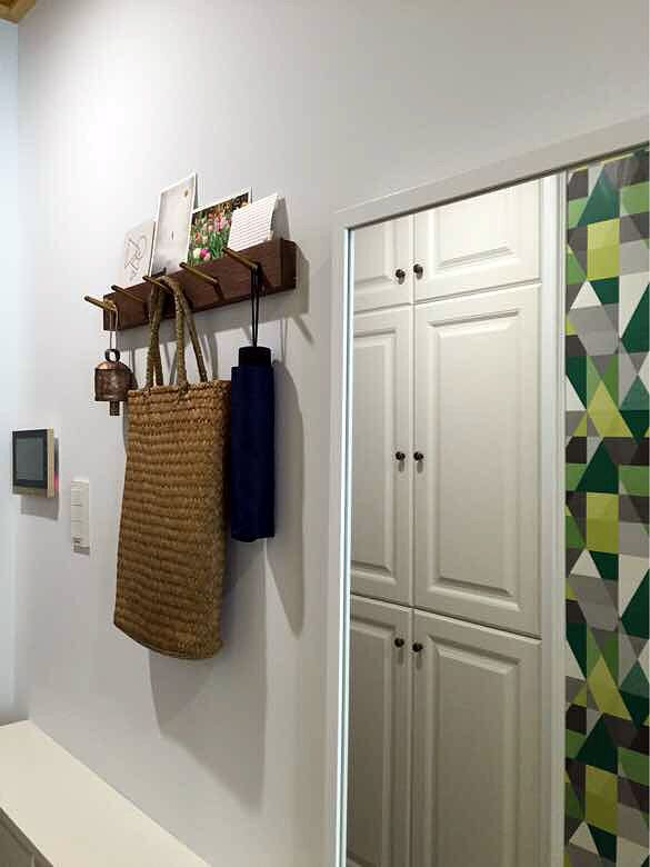 玄关鞋柜、镜子、挂钩、壁纸完成。