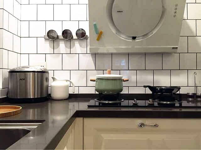 今天说说厨房吧。一年前我还是个连鸡蛋都没煮过的人,也不知道从哪天起,突然开始挥舞锅铲。想法很简单,只是觉得作为妈妈,得让孩子吃到自己亲手做的菜。另外也觉得烧得一手好菜做得一手好点心的女人是有魅力的。上次装修,厨房是被我忽略的角落。这次我格外用心,在饮食习惯比较清淡并偏西式的基础上,我选择了开放式厨房,餐厨一体。实地看过房子后,我更坚定了这一选择。因为我的厨房窗户正对中空天井,采光很差,而且面积非常小,关键是户型图上的所谓餐厅,只能放下一个小卡座,这与我梦想的大餐桌相去甚远。量房那天,设计师还发现我家燃气管道的位置让我的餐厨方位受到很多限制。