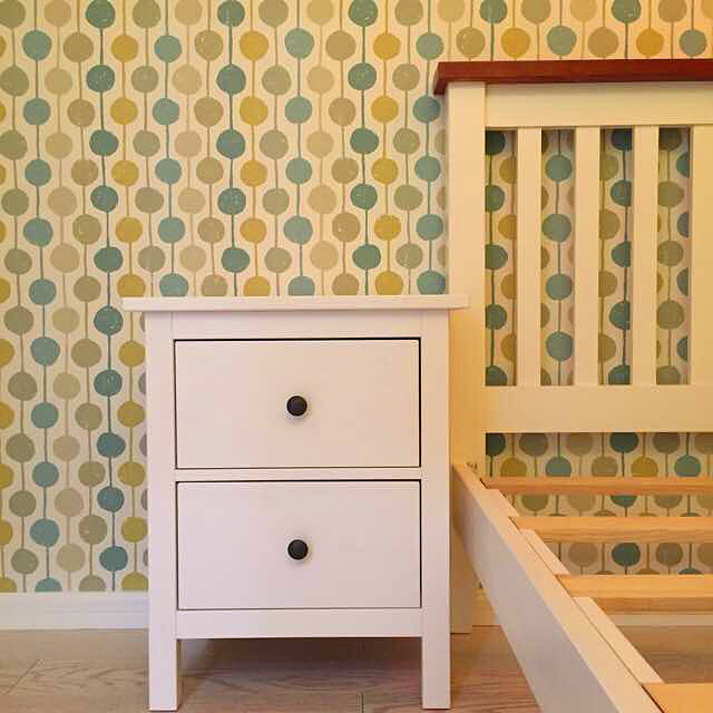 儿童房背景圆点图案,其余墙面刷浅黄绿色乳胶漆。