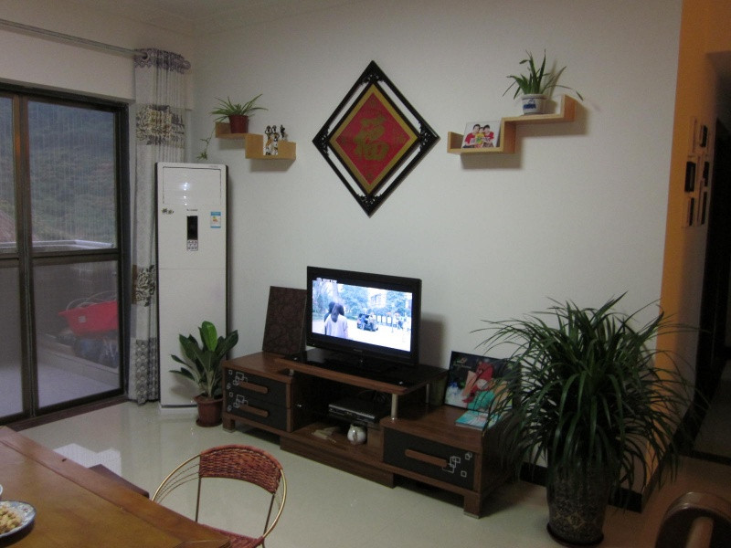 客厅入门处的柜子是木工做的,下部一半是鞋柜,一半是储物柜。衣帽架是买家具让老板送的。沙发是橡木的,1+2+3+方桌+茶几+2个小凳子——5000;电视柜1000。沙发墙和电视墙挂的十字绣是自己绣的。