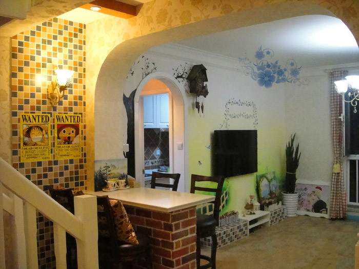 终于拥有属于自己的吧台,还有手绘的电视墙,马赛克堆砌的电视柜,漂亮的油画,红绿格子的窗帘,到处都很~田园!