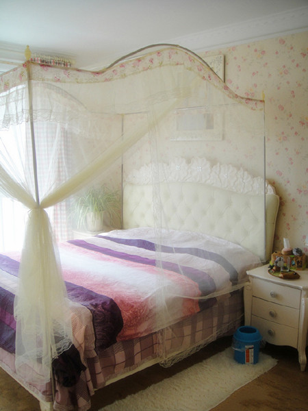 主卧的窗帘也是红绿格子,床头柜很精致哦,呵呵,我家踢脚线都是蓝色呢~~