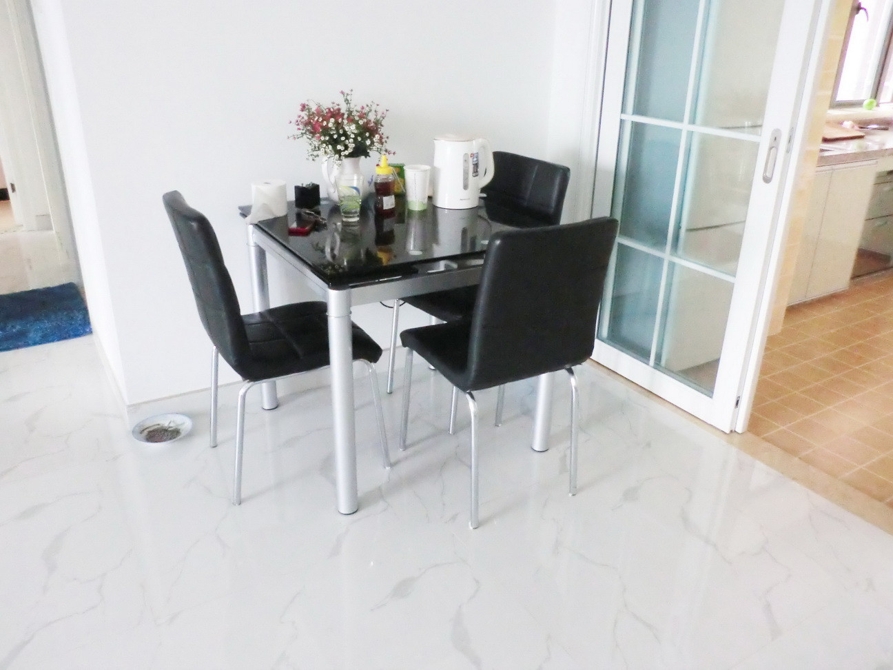 客厅瓷砖。800*800尺寸的,白色底色浅黑色不规则花纹,那个叫啥抛光砖还是啥砖啊,不记得了。