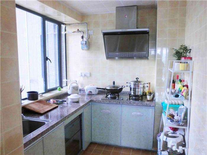 我家厨房没有装吊柜,做的L型的地柜,所以显得厨房很亮敞,但是要牺牲储物空间了。不过现在厨房完全够用了。