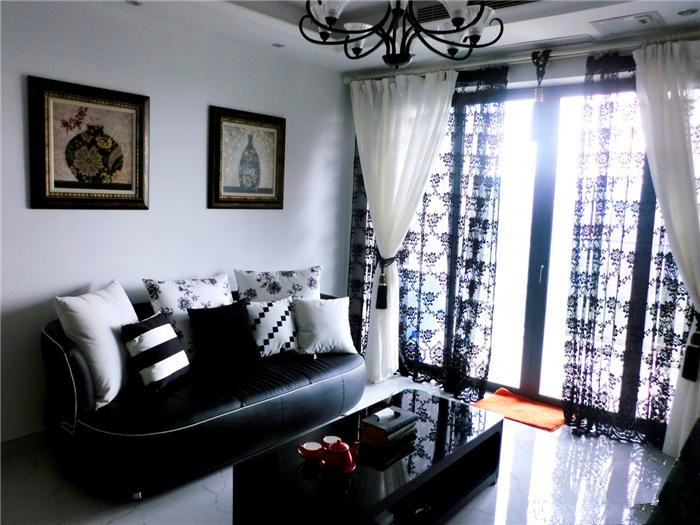 黑白主色调的客厅。照片上就是一团黑啊。买点漂亮的大型植物装饰一下就好了。。。