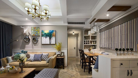 客厅:搭配米色的沙发和实木的茶几,美式的清新自然,在凝视间,从容绽放。