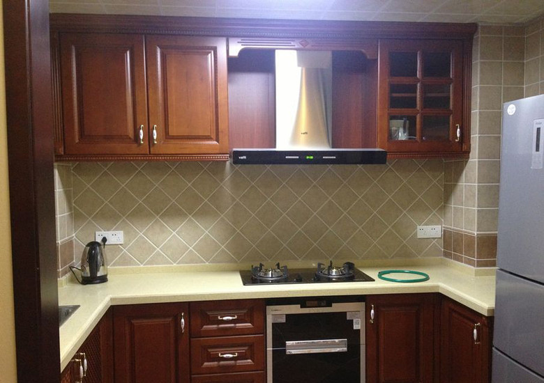 橱柜是南美红樱桃的实木,很搭美式,价格也还不算贵,一共1.2万,比了很多家,他们家最便宜了。