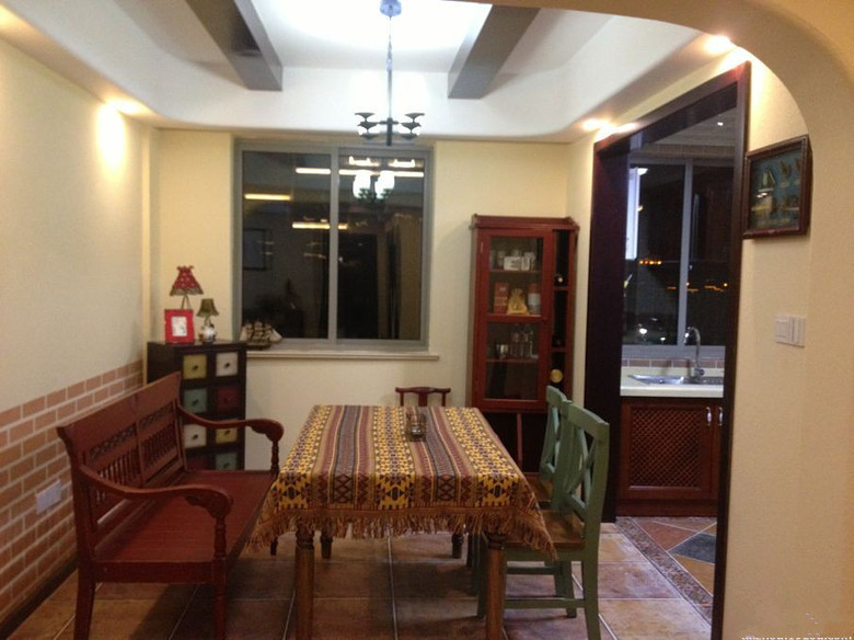 再配了一个五彩斗柜,买来800块大洋,放上两珠子串成的台灯,倒也搭配,再要去买盆植物。红色小相框里的一幅小画,是小楼自己画的,《牡丹亭》里说:似水流年,如花美眷。 实木餐桌和两把餐椅,都是在网上定制的,一共2500,很幸运,超出意料的好,用料很足,一个人扛不动,油漆也好,没什么味道。桌子上铺一块异域风情的布,放个烛台,放个梅花瓷盘,盘里是老挝的咖啡,味道很赞。 顶上的吊灯是出口欧美的外贸货,所以也不象仿制的那么泛滥,它是精致和独一的。 餐厅的墙做了砖艺的硅藻泥,110一个平方,这样显得不是太单调。本来墙上要挂电视机,后来觉得还是不挂了,距离太近,以后影响孩子的视力,也影响自己工作,还是留一面干干净净的墙。