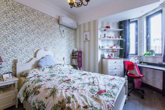 比起主卧,女儿房因其满屋清新的色调显得轻快许多。生意盎然的绿色从墙纸到床单,再到窗帘,无处不在。转角的户型正好可以定制成学习桌,侧面则用来放置抽屉以及安装收纳隔板,貌美的拼色窗帘的全貌没拍全,紫色绿色的纯色组合遮光帘辅以花边很是漂亮。
