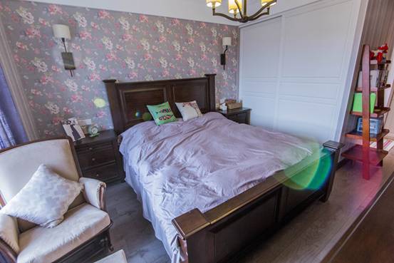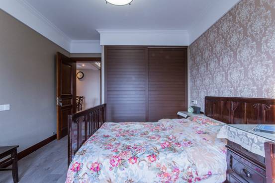 这间卧室不同于主卧的现代美式、不同于儿童房的清新,一看便知,毫无疑问是父母房了。