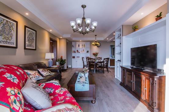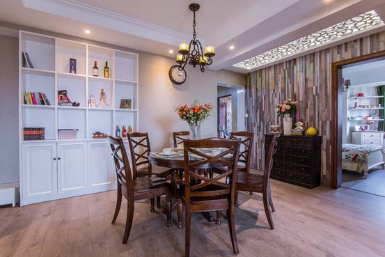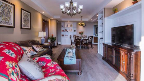 在硬装上摒弃繁琐,从简出发,没有复杂的吊顶,没有繁冗的线条。 客餐厅区域色调风格统一,重视收纳,温馨而舒适。 一些软装选择上亦不从流,留有自己的个性,比如沙发墙的挂画,再比如略有不同的美式八头灯。 电视背景墙是让木工按照自己在网上看到的效果DIY仿的,不过青藤家的木工青出于蓝而胜于蓝。 两侧边柜加美式造型墙的组合美观实用,线条硬朗利落,电视柜区域的设计因顶端墙纸调色显得与众不同。 虽说与众不同,却毫无突兀感,只因主客厅的墙纸都采用了同款挺括的亚麻质感墙纸, 固定边柜上摆放了青藤旅途中搜罗来的各自各样的玩意儿,鉴证她那些年天南海北的时光。
