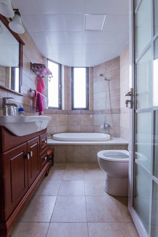 主卫清清爽爽,漂亮的边角墙型包裹着浴缸,秋冬时节,泡泡热水澡别提多煞羡旁人了。
