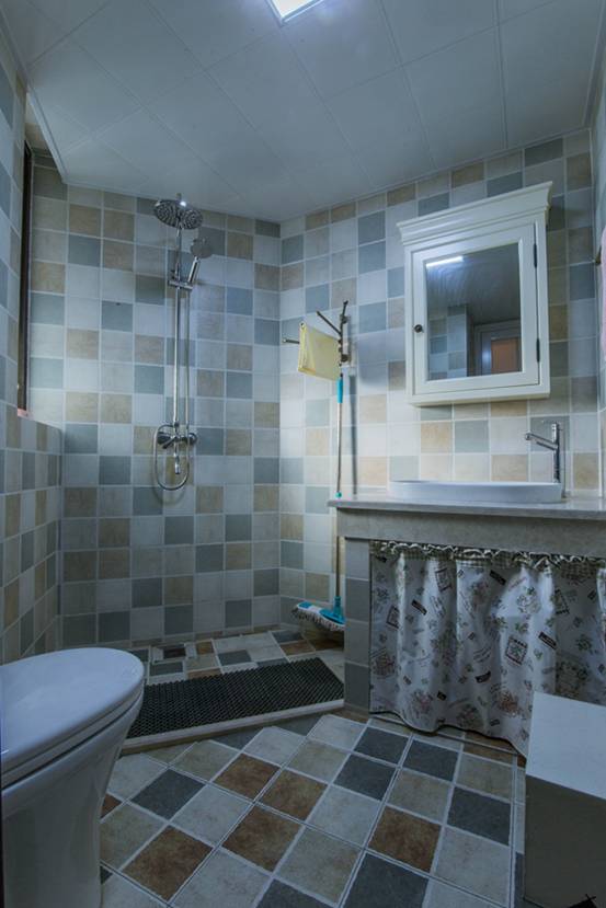 比起观感上比较大气的主卫,次卫显得活泼可爱些。格局的异型使得空间确实算不上大,但麻雀虽小五脏俱全。