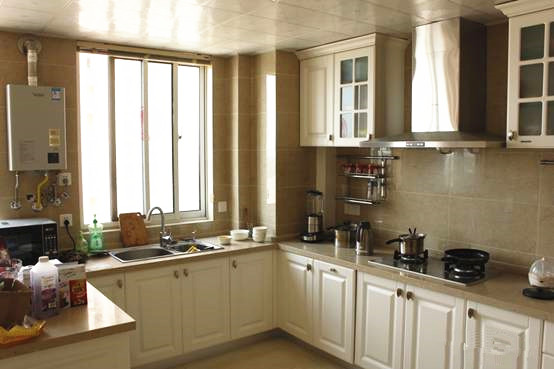 热水器装在厨房两个窗户中间,正对导台的位置, 怎么样弄才能美观一点?