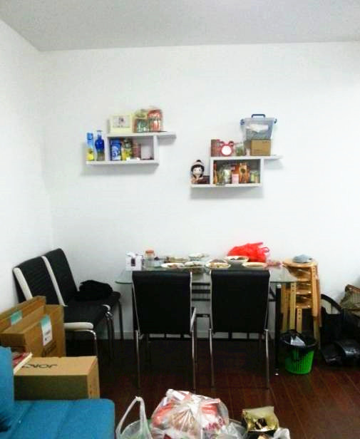 从家里拿过来的玻璃圆桌;暂时用作零食桌吧;