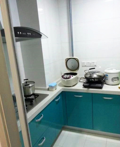 冰箱放在一进门左手边的地方;这是从客厅看厨房;网购冰箱的时候也不懂尺寸的说法;到家才发现好小;