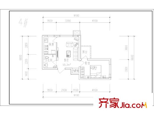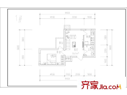 博仕园二期1、4号楼55.1平一室户型 1室1厅1卫1厨