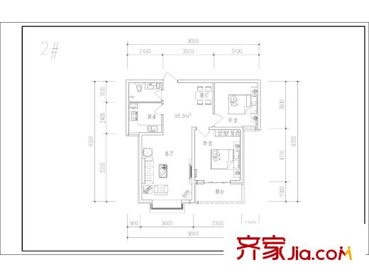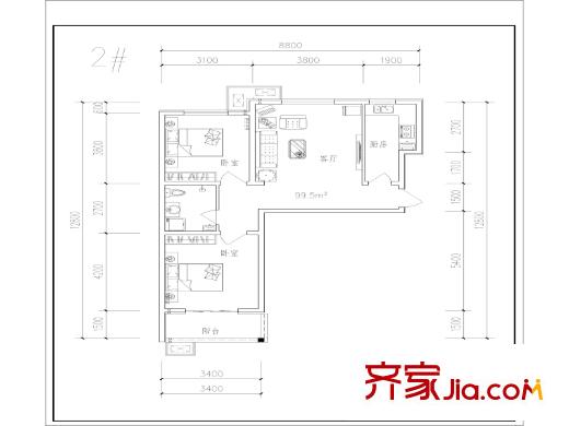 博仕园二期2、3号楼99.5两室户型 2室2厅1卫1厨