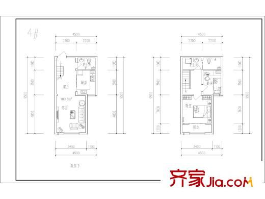 博仕园二期1、4#楼100.3平跃层两室户型 2室2厅2卫1厨