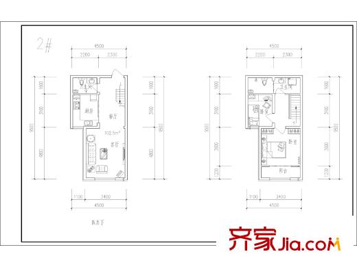 博仕园二期2、3号楼102.5平跃层两室户型 2室2厅2卫1厨