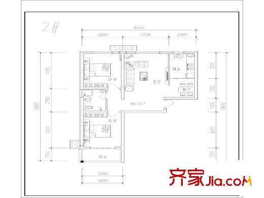 博仕园二期2、3号楼99.2平两室户型 2室2厅1卫1厨