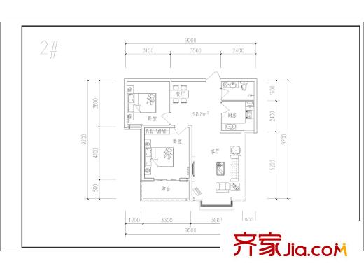 博仕园二期2、3号楼98.8平两室户型 2室2厅1卫1厨