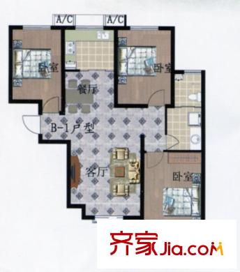 博世花倾城二区户型图B1户型 3室2厅1卫1厨